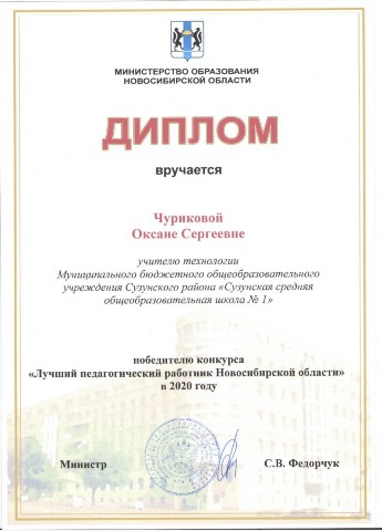 диплом Министерства образования НСО за победу в конкурсе "Лучший педагогический работник Новосибирской области", 2020 год |