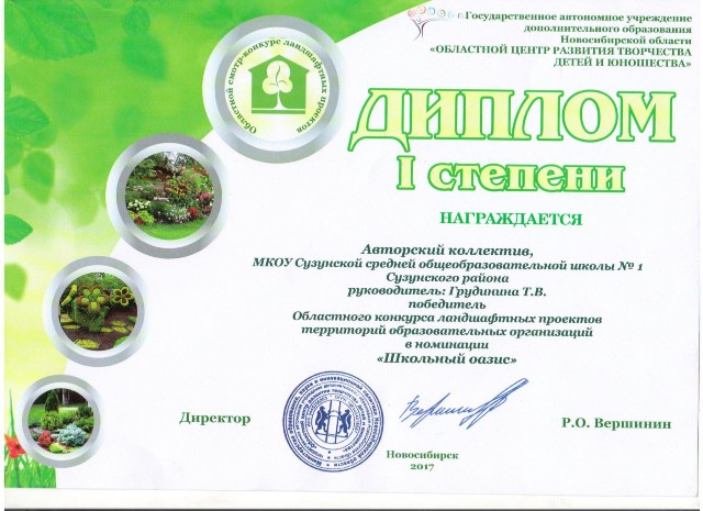 МКОУ "Сузунская СОШ №1" диплом 1 степени за победу в конкурсе ландшафтных проектов территорий образовательных организаций, 2017 год |
