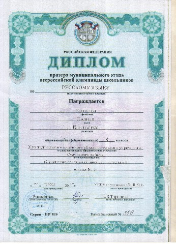 диплом Вагановой Полины, призера муниципального этапа ВсОШ по русскому языку, 2017 год | |